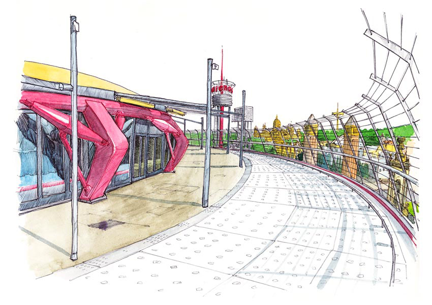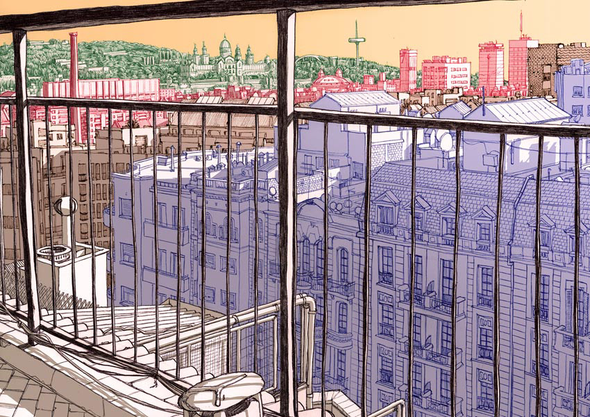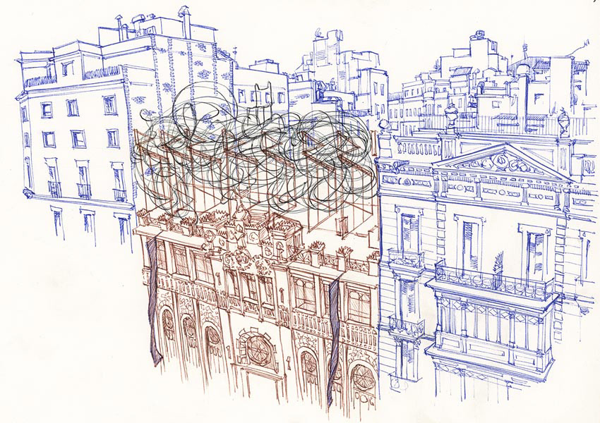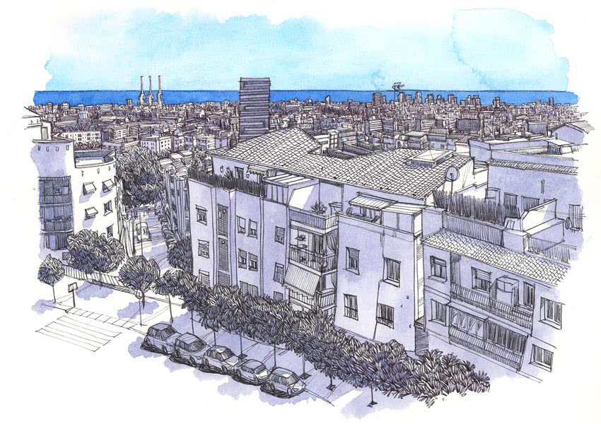 Drawings made on location and colored in studio.